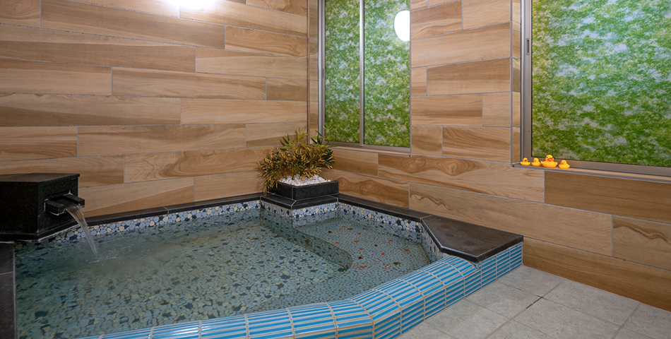 彩り豊かな床デザインが印象的な2つの貸切風呂で、